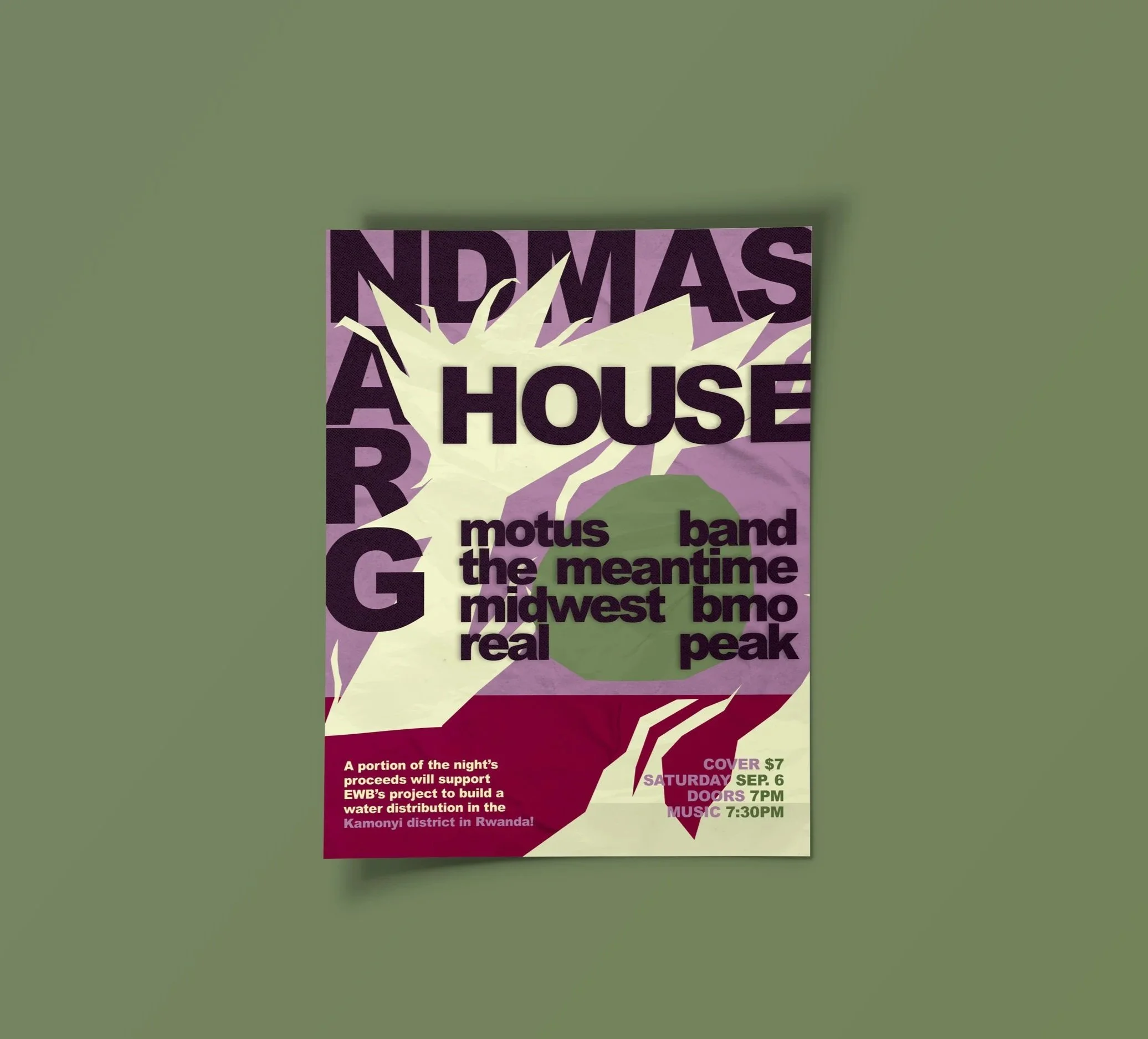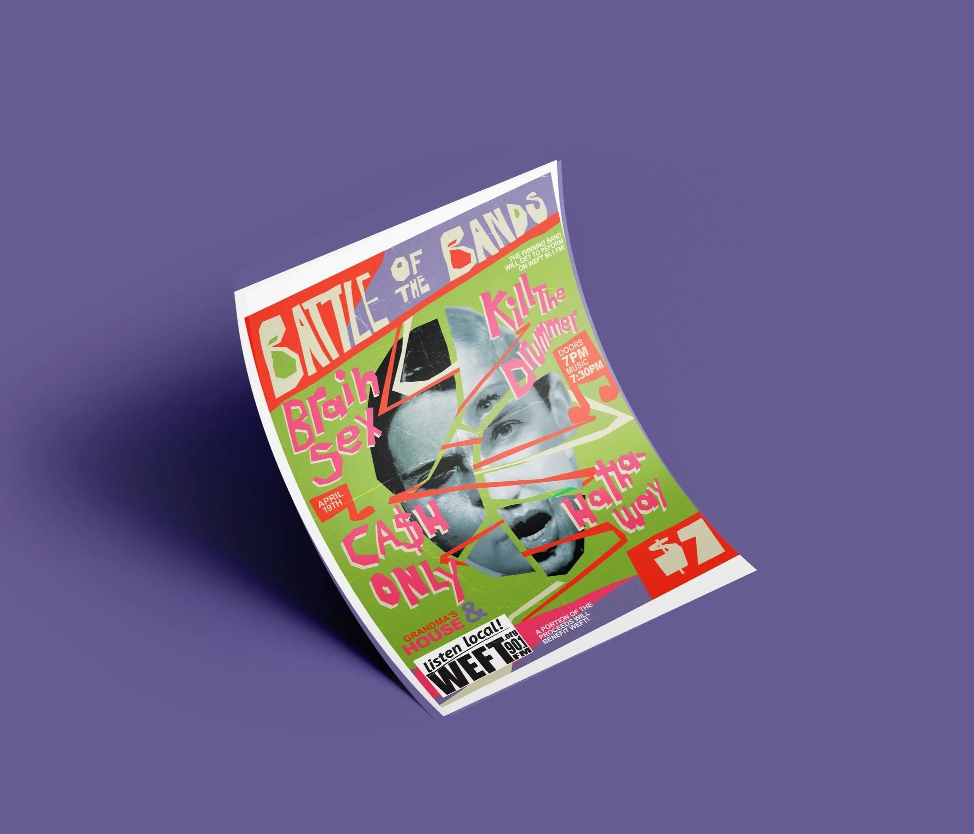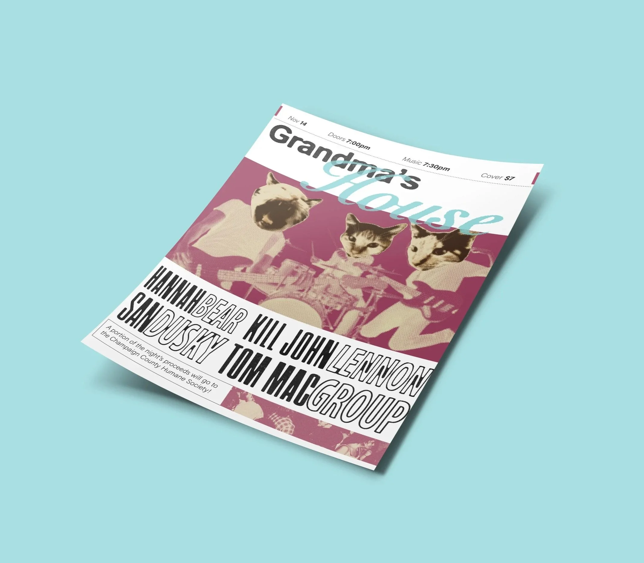 Flyers I make for "Grandma's House" - a local show venue in Urbana, IL. I get basically all creative freedom when it comes to the design. My clients who own the music venue only specify the times, dates, and artists performing. These flyers have become a great way to exercise my design skills or try new techniques I wouldn’t get to try on a class project. I have gained a lot of knowledge for the adobe programs with these flyers since they give me new design strategies to learn.
